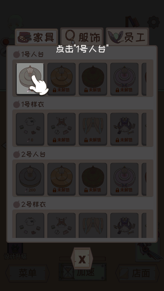 3、在菜单中,按照【点击"1号人台"】的指引,点击相应选项,开始布置或管理店铺相关设施。