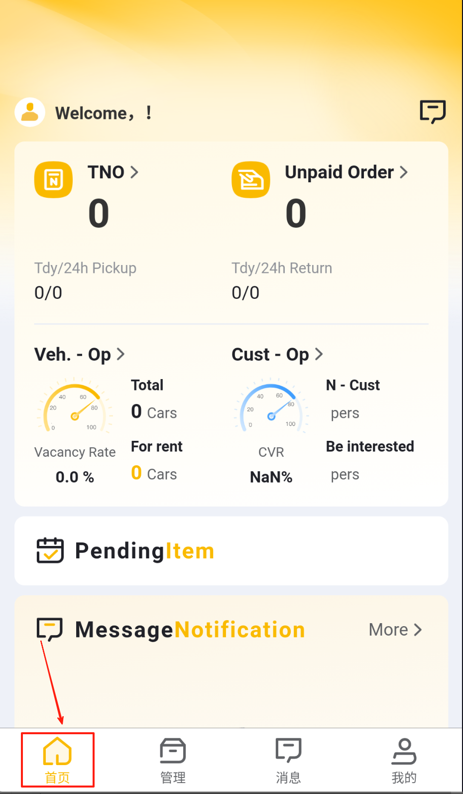 3、首页数据看板重点看车辆空置率和潜在客户数,红色数字代表需紧急处理,点击More能展开详细图表分析运营趋势。