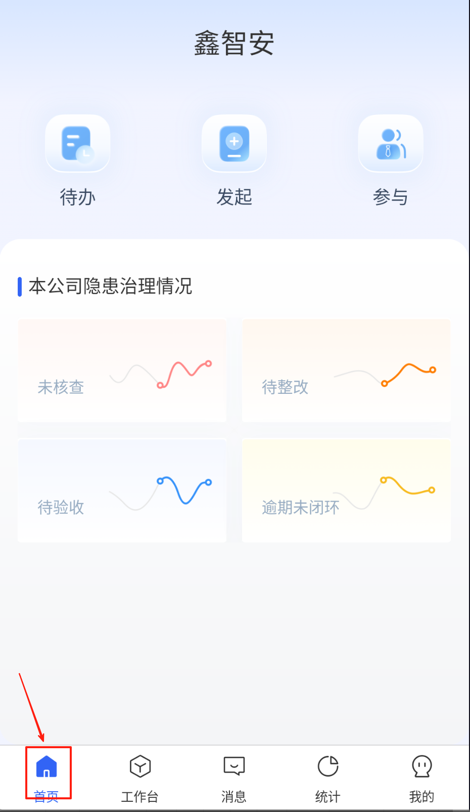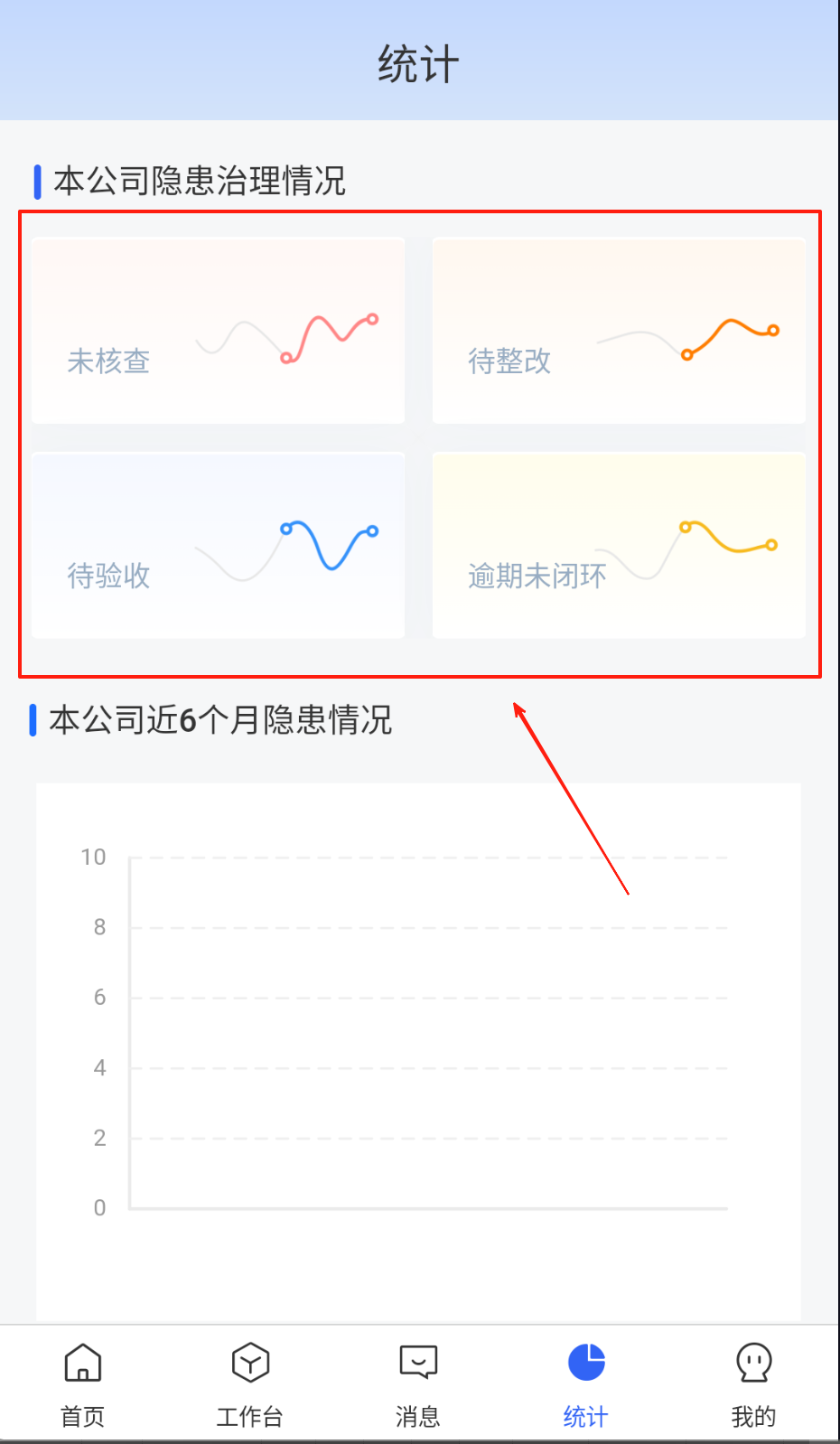 3、统计界面可切换折线图与饼状图模式,直观查看近半年隐患处理进度数据。