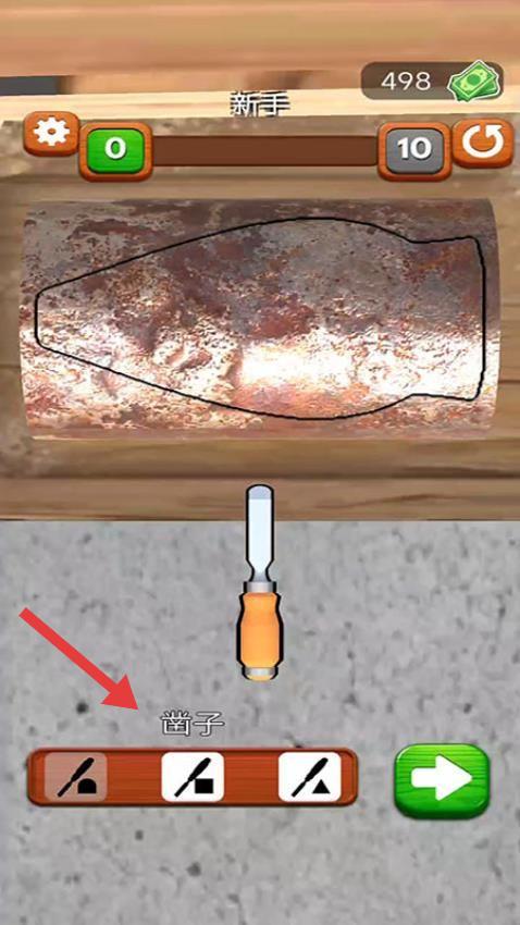 1、进入游戏雕刻界面,选择【凿子】工具,根据提示开始雕刻,留意界面数值变化。