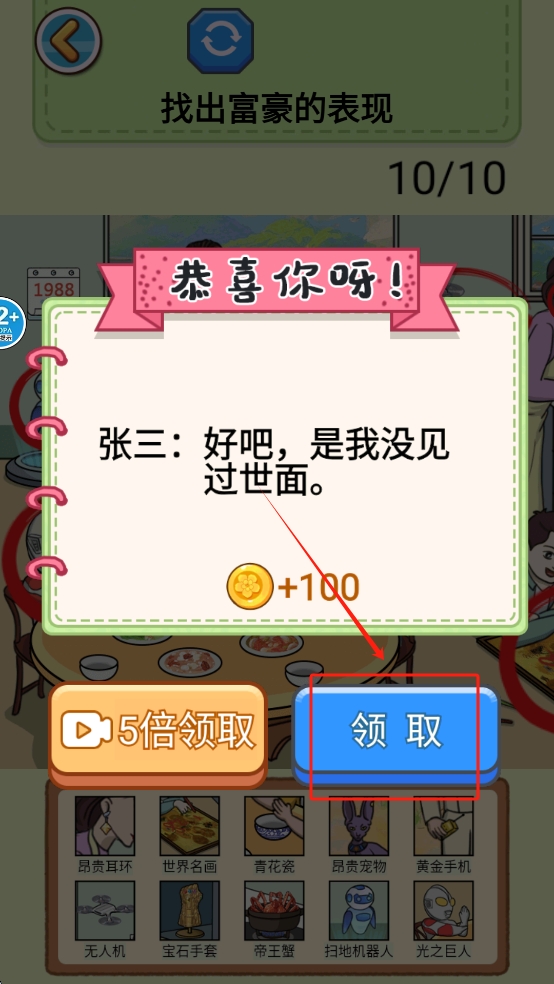 4、在游戏挑战中找到所有富豪的表现后,点击“领取”按钮,领取游戏奖励。