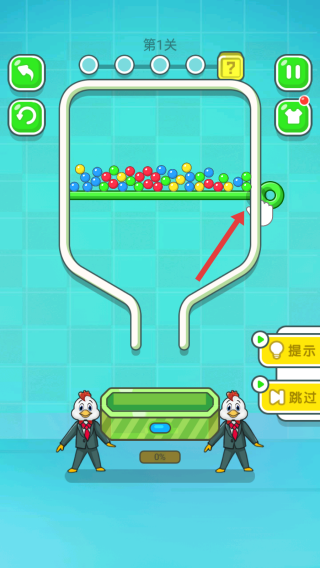 2、进入第1关,按箭头指向点击绿色拉环,让彩色小球下落。