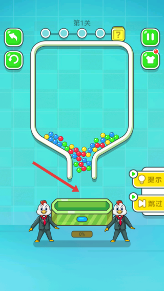 3、使小球落入下方容器,完成关卡目标,按箭头方向继续推进游戏。