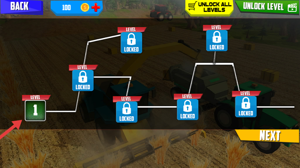 2、关卡选择界面从已解锁的【LEVEL-1】开始挑战,后续关卡需满足条件解锁,点击【NEXT】可查看更多关卡。