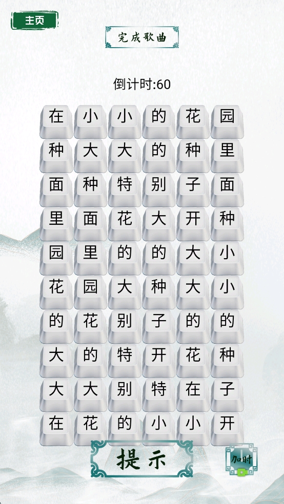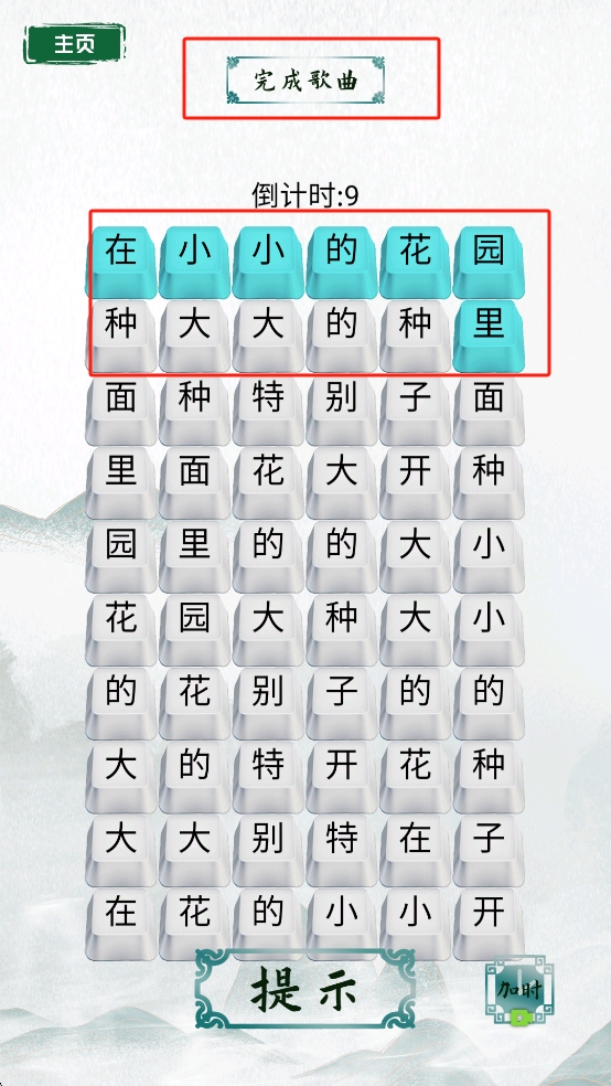 3、在游戏关卡中,根据提示在限定时间内找出正确的汉字组合,字块完成句子。