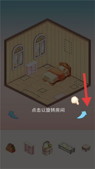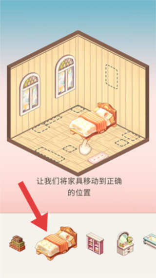 1、在游戏界面,按箭头指向将床拖动到房间内对应虚线框位置。
