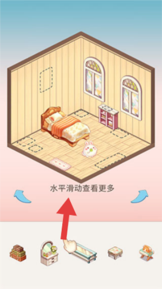 3、按箭头方向水平滑动屏幕,查看更多家具放置区域,继续完成家具摆放任务。