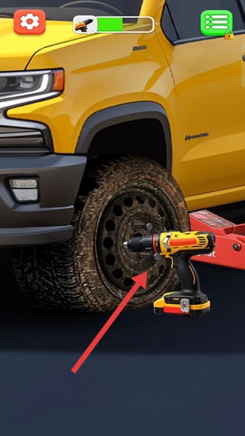 3、用电动工具拆卸黄色卡车的旧轮胎,更换新轮胎,观察进度条确保安装牢固,完成维修。