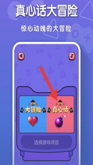 2、进入“真心话大冒险”界面,按箭头指示点击【真心话】选项。