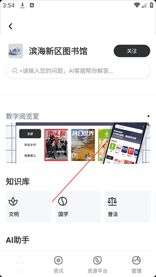 3、在滨海新区图书馆详情页面,点击“数字阅览室”板块。