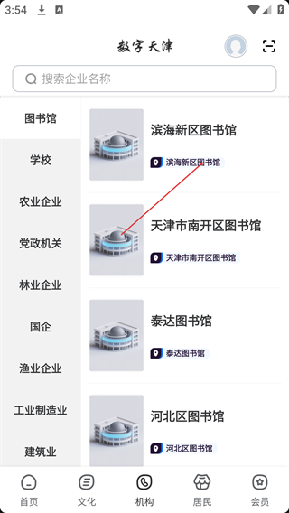 2、在机构分类页面,选择“图书馆”分类下的【滨海新区图书馆】,进入该图书馆的详情页面。