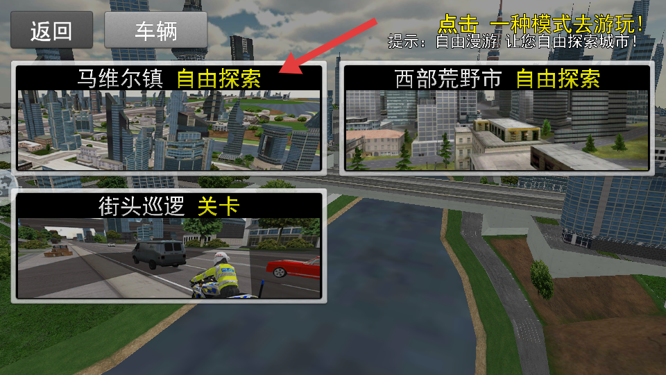 2、在模式选择界面中,可根据喜好点击【马维尔镇-自由探索】【西部荒野市-自由探索】尽情探索,或选【街头巡逻-关卡】挑战关卡。