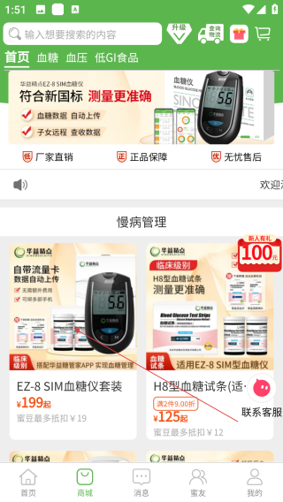 3、全场景商城服务:精选血糖仪、试纸、控糖食品等产品,价格优惠且支持蜜豆抵扣,足不出户满足护理需求。