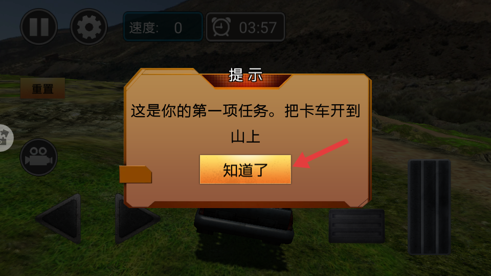 3、接到提示【这是你的第一项任务。把卡车开到山上】,点击【知道了】后,操控卡车完成任务,掌握基础驾驶技巧。