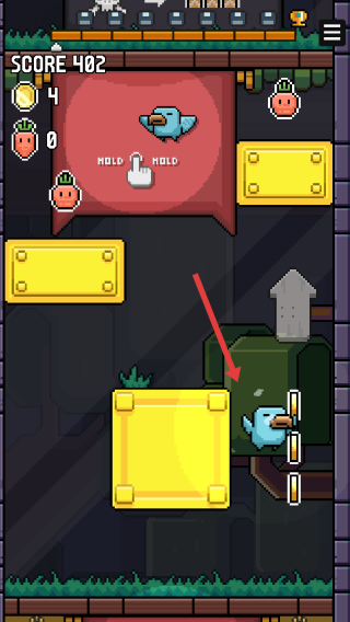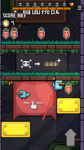 3、继续按箭头指引,操控小鸟获取胡萝卜道具,推进关卡进程。