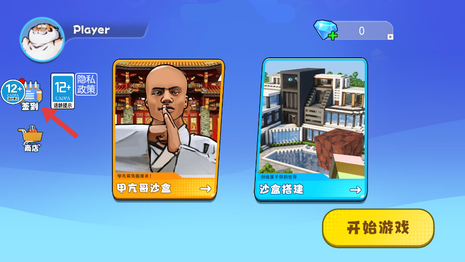 1、进入游戏主界面,可选择【甲亢哥沙盒】或【沙盒搭建】模式,点击【开始游戏】开启体验,记得先查看左侧【签到】获取奖励。