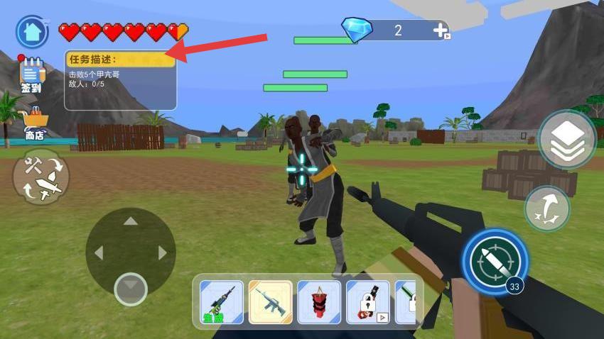 3、游戏内查看【任务描述:击败5个甲亢哥】,利用屏幕下方武器栏选择武器,通过虚拟按键操控角色完成任务,熟悉游戏操作与战斗机制。