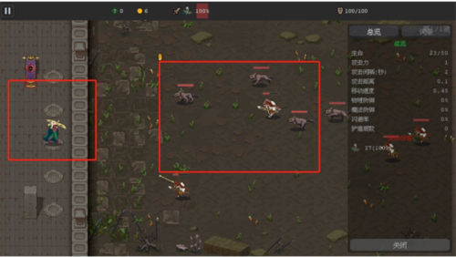 2、进入游戏后,左侧为玩家的角色,右侧是敌方怪物,你需要阻止敌人攻击你的城墙。对局中角色可以自动索敌攻击,玩家也可以选择点击或长按屏幕控制角色的攻击方向。