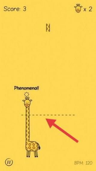 1、在游戏过程中,按箭头方向操作,让长颈鹿头部触碰对应位置,获得“Phenomenal!”评价,增加分数(Score:3)。