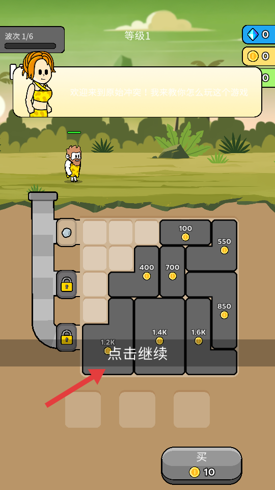 1、进入游戏,看到提示【欢迎来到原始冲突!我来教你怎么玩这个游戏】,点击【点击继续】,跟随引导了解游戏。