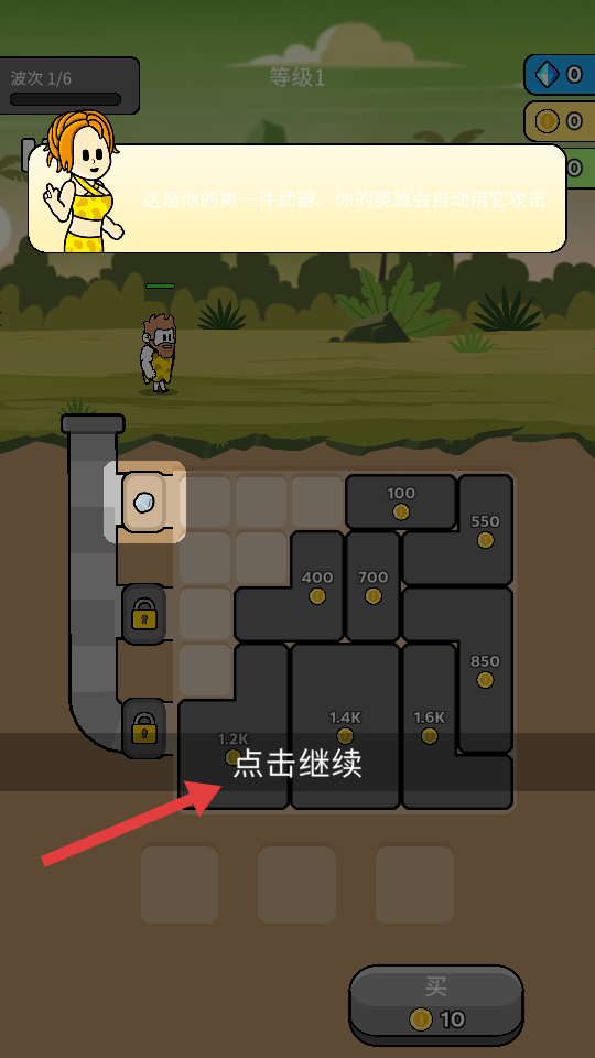 2、出现提示【这是你的第一件武器。你的英雄会自动用它攻击】,继续点击【点击继续】,熟悉英雄攻击机制。