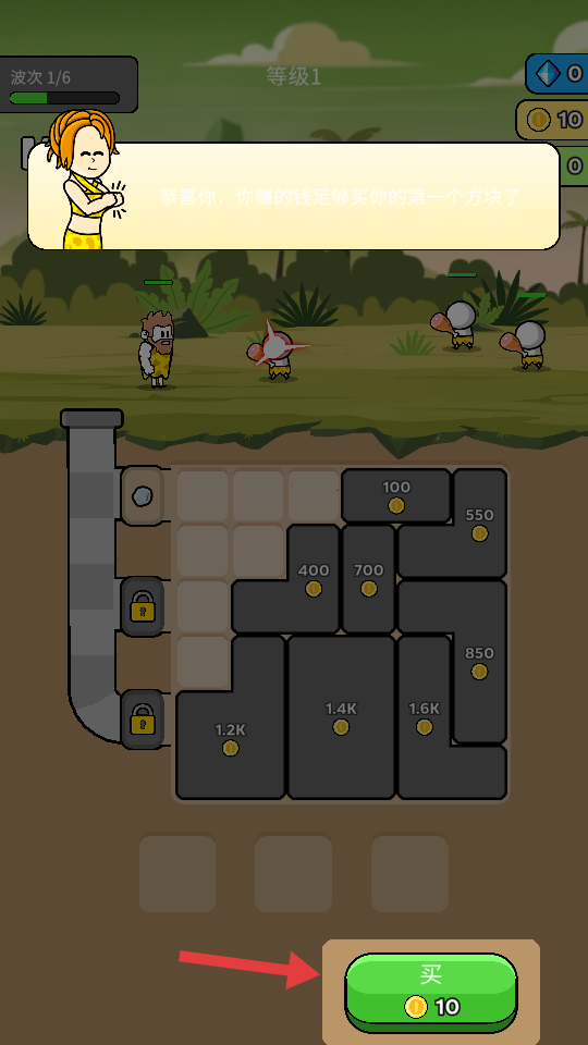 3、当提示【恭喜你,你赚的钱足够买你的第一个方块了】,点击绿色【买】按钮,购买第一个方块,开启游戏建造环节。