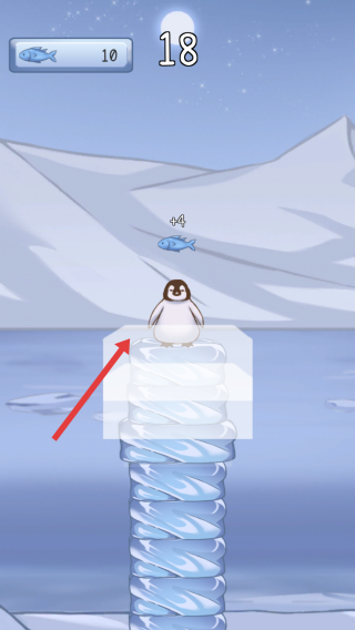 3、持续按箭头方向引导操作,使企鹅不断堆叠冰块、收集鱼,提升分数。
