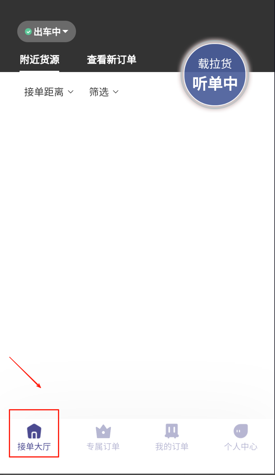 1、启动应用后进入接单大厅界面,系统自动定位周边货源信息,通过筛选条件快速定位符合运输要求的订单。
