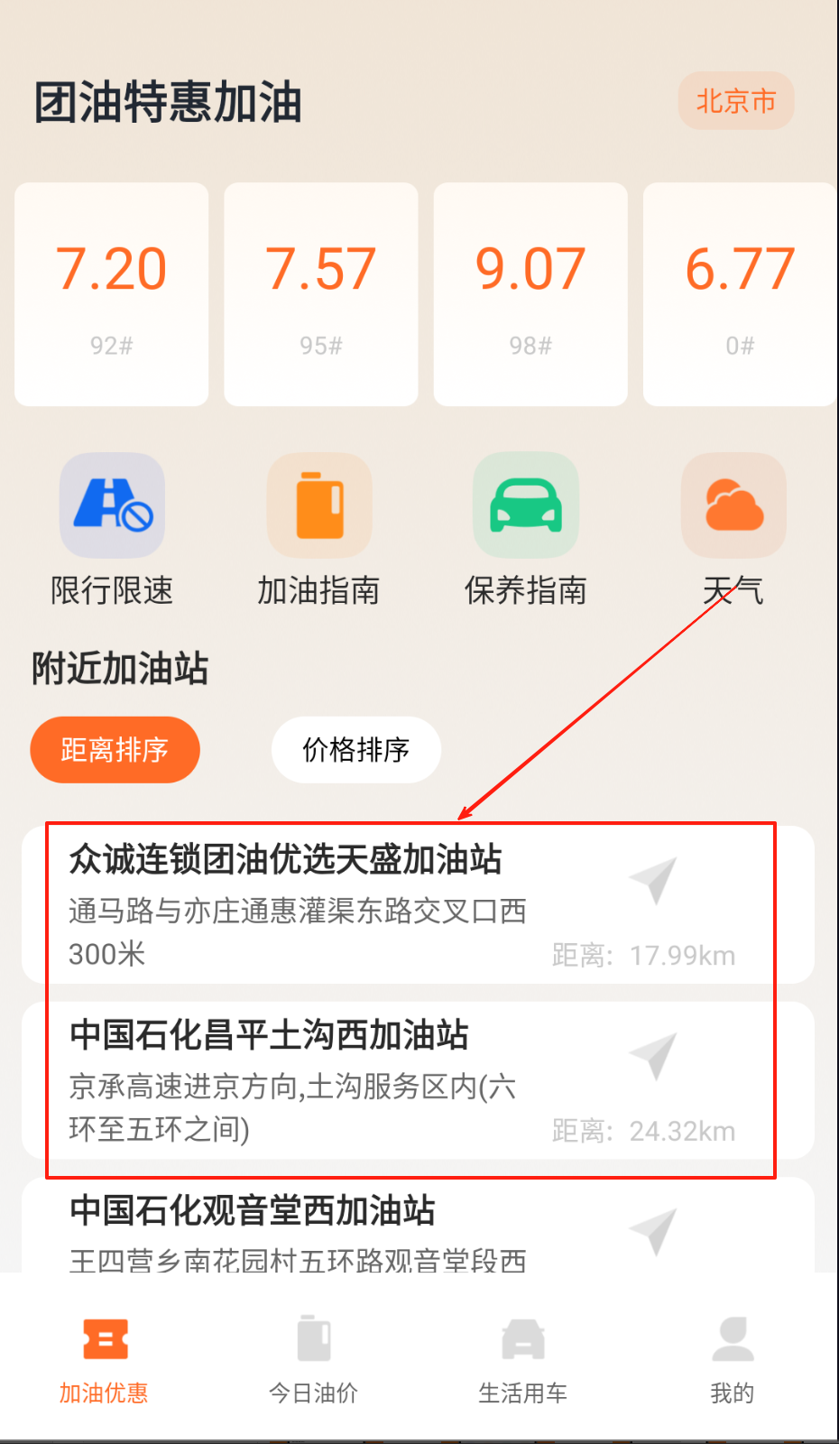 2、通过今日油价查看不同标号燃油的即时报价,优先选择标注限时优惠活动的油站进行比价。