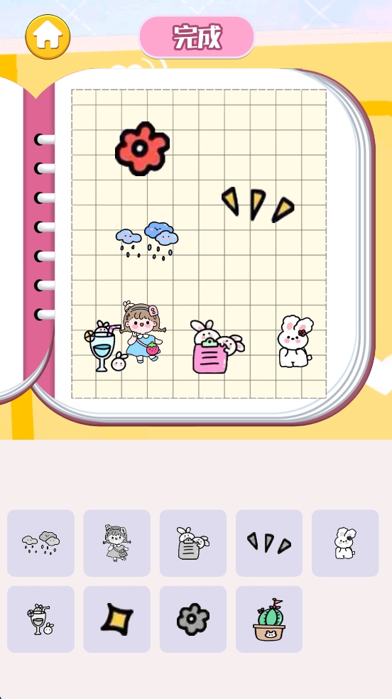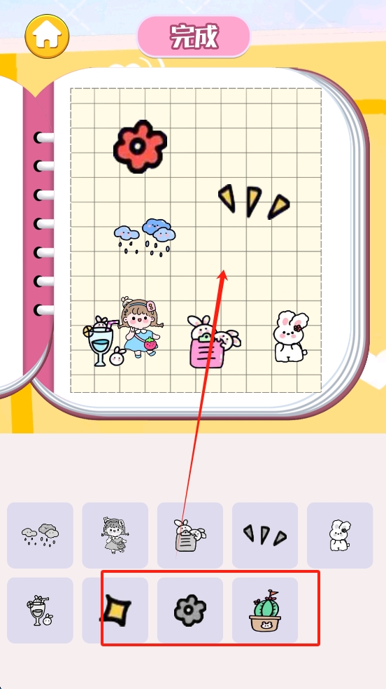 4、在游戏主界面,点击下方的贴纸图标,将其拖动到上方的网格中,完成图案。