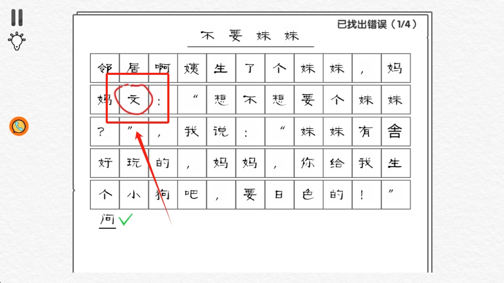 1、基础纠错模式:在场景中找出所有错别字,用画线方式将其改正。系统会即时判断正误,给出相应反馈。
