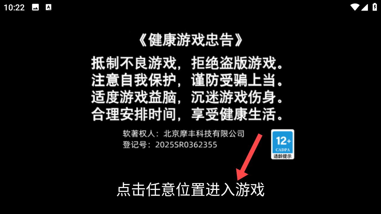 1、在《健康游戏忠告》界面,点击任意位置进入游戏。