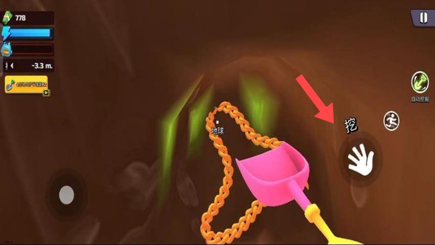 1、进入游戏后,点击屏幕右侧的【挖】按钮开始挖掘,留意左上角的资源数值(如778)和深度(如-3.3m),合理规划挖掘路径。