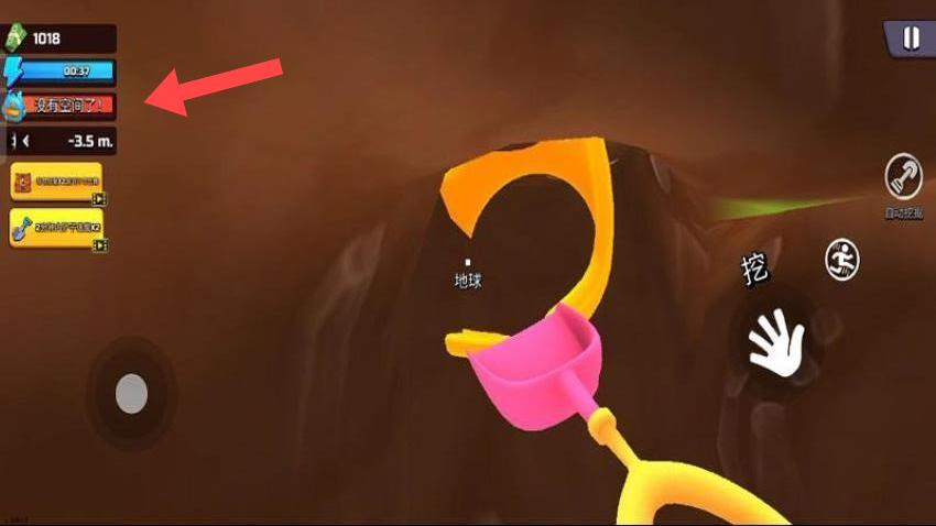 2、当出现“没有空间放入”提示时(如图中资源变为1018,深度-3.5m),及时清理背包或升级背包空间,确保有足够空间继续收集挖掘物品。
