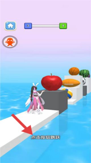 1、在游戏场景中,按提示点击屏幕上的按钮,操控角色跳跃,沿平台前进。