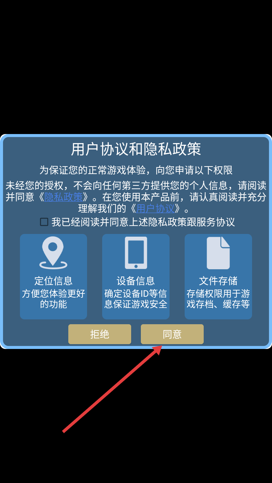 1、进入游戏,点击【同意】。