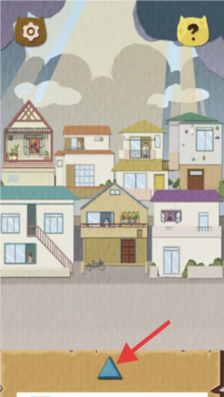 2、在房屋场景中,按箭头指向点击底部蓝色三角形,触发相应游戏环节或剧情。