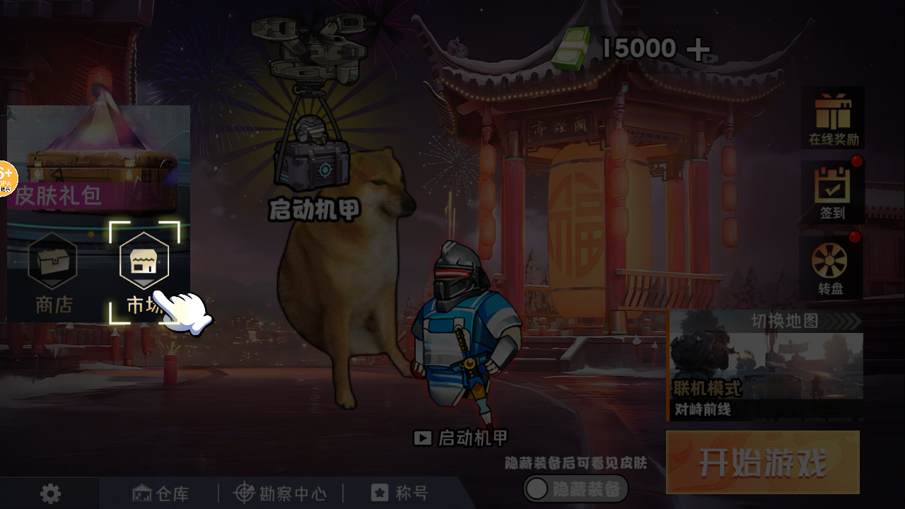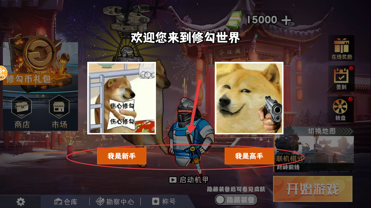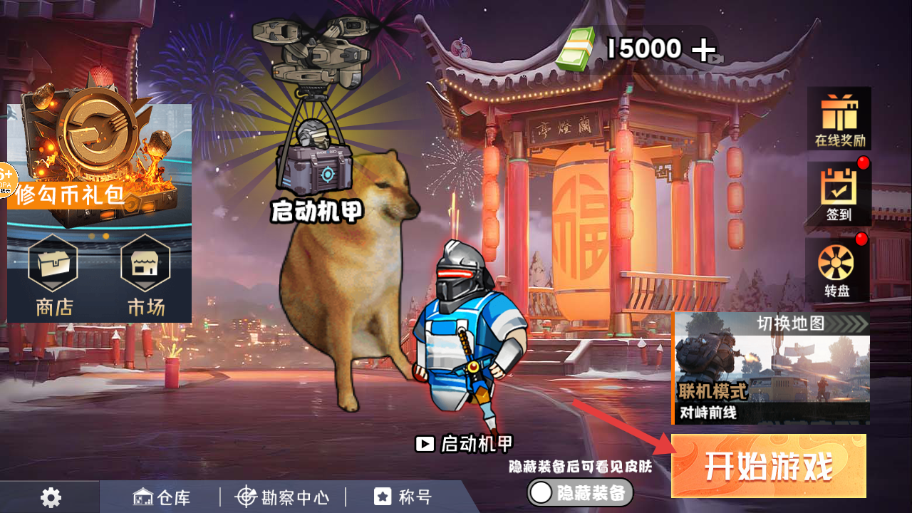 1、进入游戏主界面,可先留意左侧【修勾币礼包】【商店】【市场】等功能入口,准备好后点击【开始游戏】开启冒险,或点击【启动机甲】体验特色玩法。