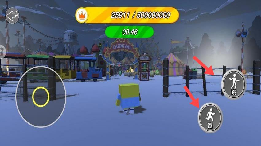 1、进入游戏后,通过左下角的移动摇杆控制角色移动,右下角的“跑”和“跳”按钮可辅助快速移动与躲避障碍。