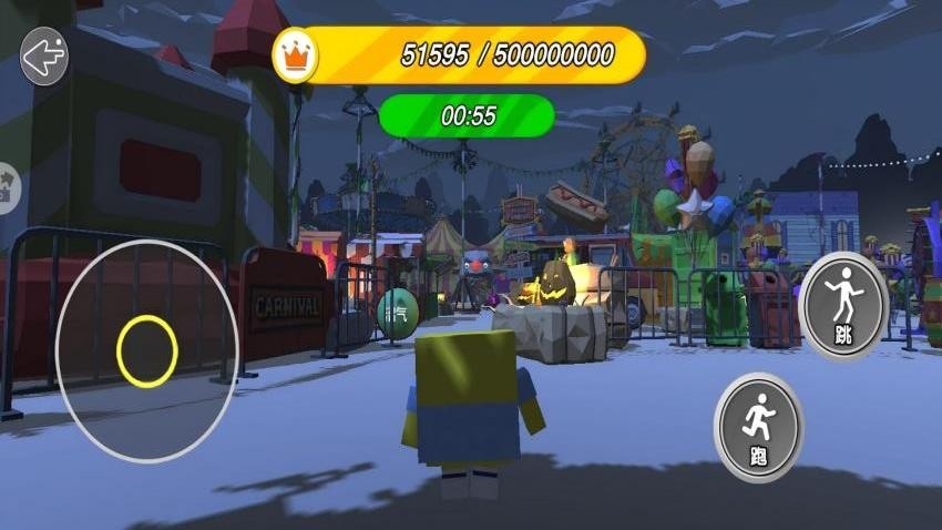 3、探索场景路径,利用“跑”加速、“跳”躲避或获取高处物品,持续收集以增加分数(如达到51595/500000000),完成游戏目标。