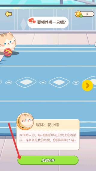 1、在领养界面,按箭头指向点击【免费领养】按钮,领养名为“花小喵”的猫咪。