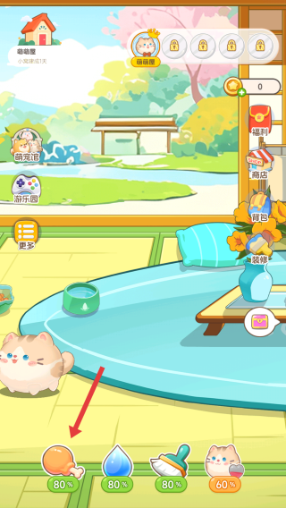 2、进入养猫场景后,关注底部状态图标,按箭头方向查看对应状态数值(均为80%)。