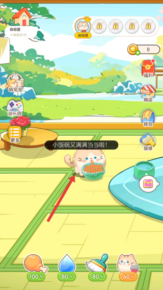 3、按箭头指向进行喂养操作,使猫咪进食,画面显示“小饭碗又满满当当啦”,食物状态提升。