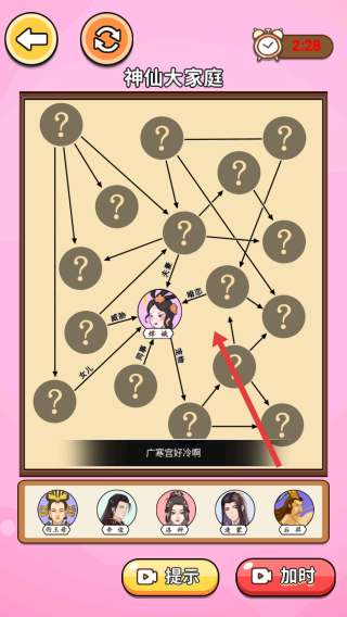 3、在“神仙大家庭”关卡中,按箭头方向进行角色与图中位置的匹配或连线操作,完成关卡任务。