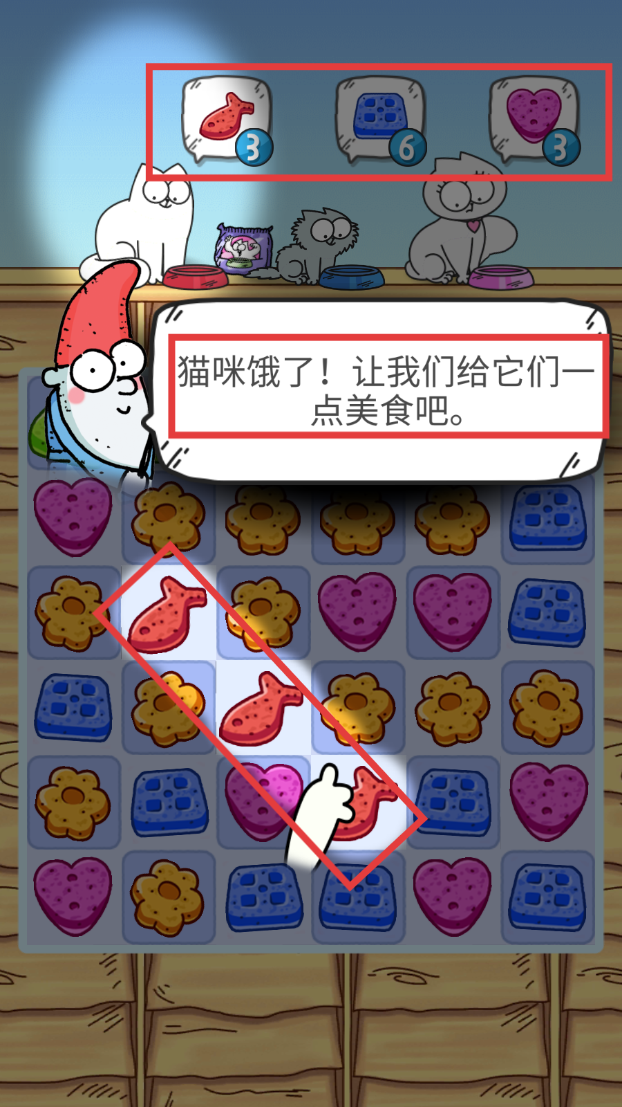 1、按照上方【鱼、方块、爱心】图标显示的数量要求,在消除界面中消除相应图案喂猫咪。