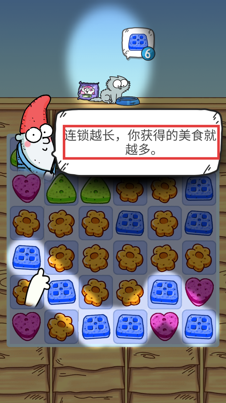 2、在消除游戏中尽量延长连锁,如提示所说【连锁越长,获得的美食越多】。