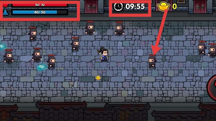 2、战斗时注意上方【生命值(10/10)、能量值(40/50)】状态,在限定时间【09:55】内消灭敌人并收集金币。
