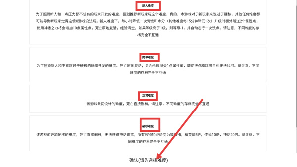 1、在难度选择中,【圣人模式】适合新手,【简单难度】死亡可复活;【正常难度】为游戏原始设定,【硬核难度】最难,死亡直接删档。