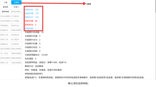 3、选定种族后,查看【初始生命】【初始饥饿】等属性,了解其特性(如恢复强、伤害高但打材料麻烦),据此合理开启游戏。