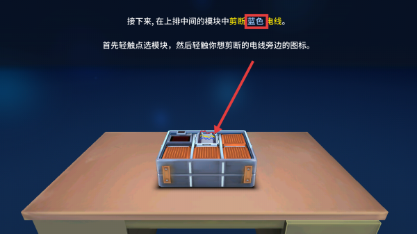 1、根据提示,在上排中间的模块中,先轻触点选模块,然后轻触【蓝色】电线旁边的图标进行剪断操作。